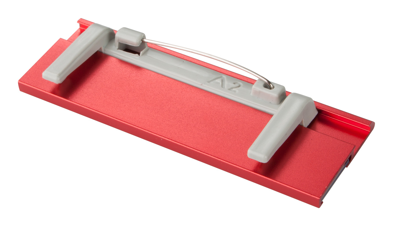 Jmenovka z hliníku s vyměnitelnými papírky.