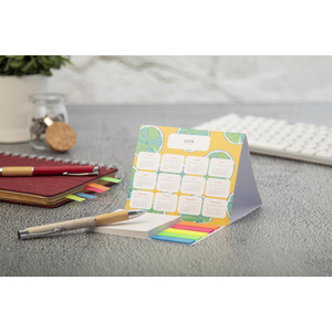 Zakázkový papírový kalendář se samolepícími lístky. Obsahuje 50 listů samolepicích papírů z recyklovaného papíru (75×75 mm) a 100 plastových fóliových značkovačů stránek v 5 různých barvách (44×12 mm). Cena zahrnuje celobarevně potištěný vnější obal, nezahrnuje tiskovou přípravu. Min. mn.: 100 ks.