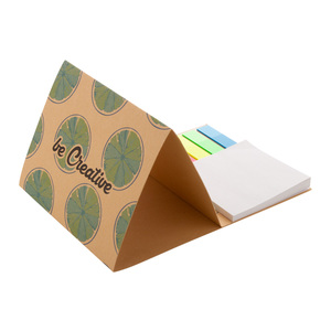 Zakázkový kalendář z kraftového papíru se samolepícími lístky. Obsahuje 50 listů samolepicích papírů z recyklovaného papíru (75×75 mm) a 100 plastových fóliových značkovačů stránek v 5 různých barvách (44×12 mm). Cena zahrnuje celobarevně potištěný vnější obal, nezahrnuje tiskovou přípravu. Min. mn.: 100 ks.