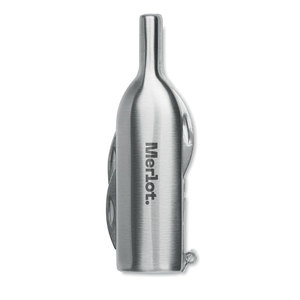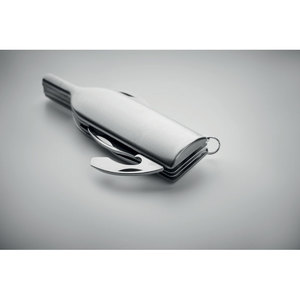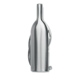 Kapesní nůž z nerezové oceli ve tvaru láhve se 4 funkcemi: otvírák na láhve, nůž, vývrtka a klíčenka.