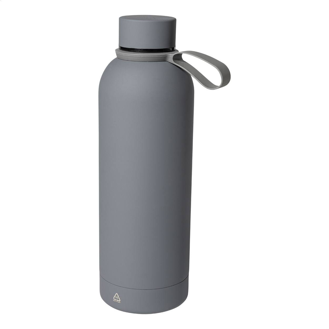 Dvoustěnná vakuová láhev z recyklované nerezové oceli s pogumovanou úpravou a silikonovým páskem, 500 ml.