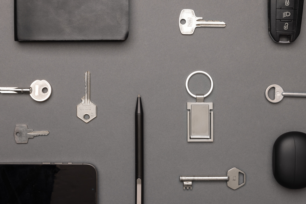 Klíčenka se stojánkem na telefon z RCS recykl. slitiny zinku
