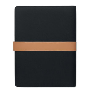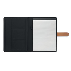 Portfolio A4 z materiálu RPET s detaily z umělé kůže. Vyměnitelný poznámkový blok A4. 30 linkovaných stran z recyklovaného papíru. Držák na tužky. Čtyři přihrádky na karty, tři malé kapsy a jedna velká přihrádka. Uzavírání na magnetický popruh.
