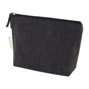 Kosmetická taštička na zip ze 70 % recyklované bavlny a 30 % RPET polyesteru, 280 g/m². S výraznou etiketou o recyklované bavlně.