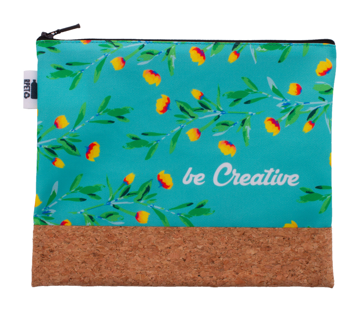 Na zakázku vyrobená kosmetická taštička na zip z 600D RPET polyesteru a přírodního korku. S celoplošně tištěnou sublimační grafikou, nezahrnuje tiskovou přípravu. Min. mn.: 50 ks.