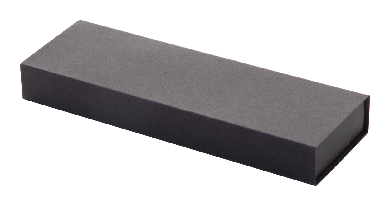 Sada per z recyklovaného hliníku s rollerem a kuličkovým perem v černé papírové dárkové krabičce. S modrou náplní.
