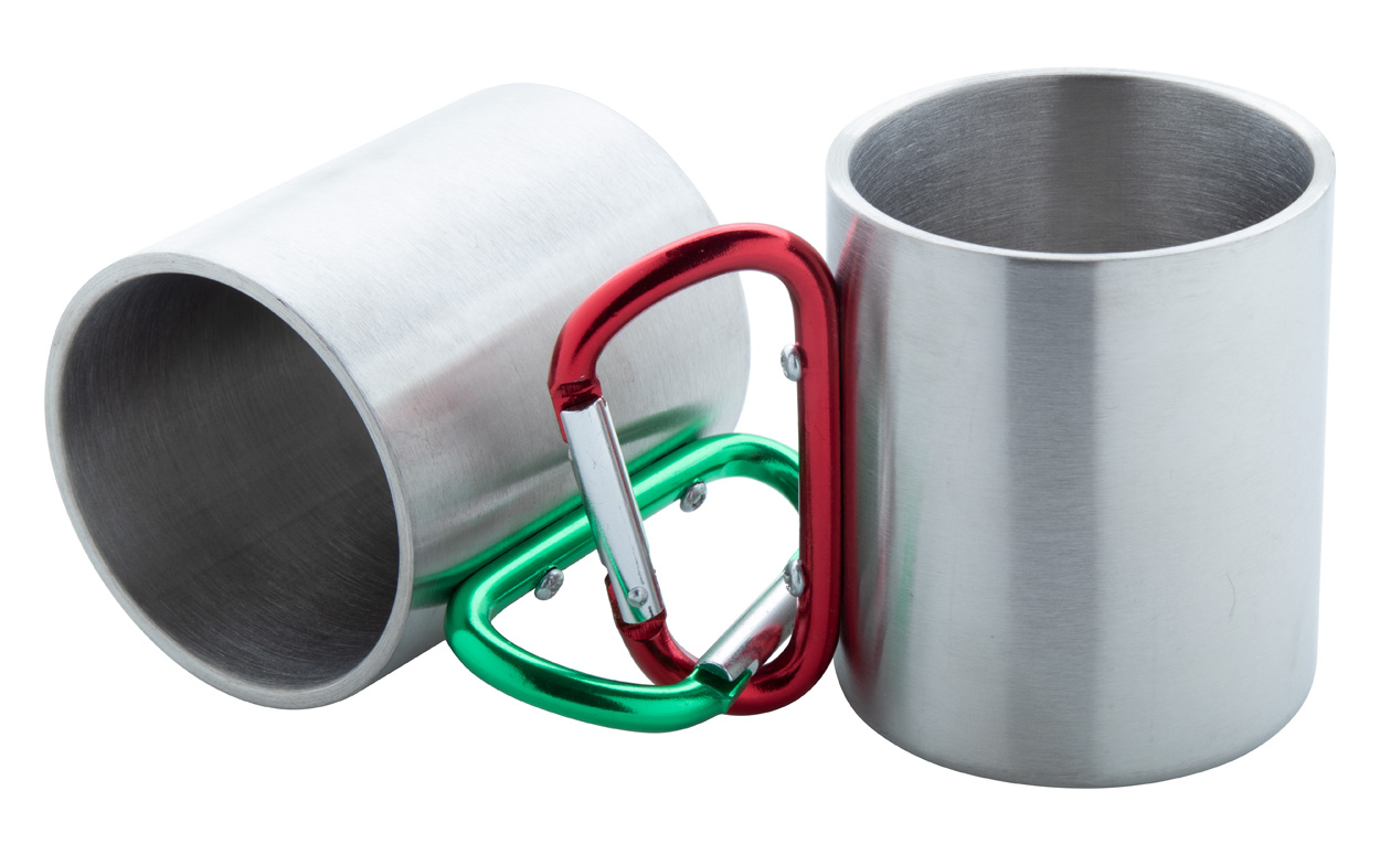 Hrnek z nerez oceli s barevnou karabinou, 200 ml. V dárkové krabičce.