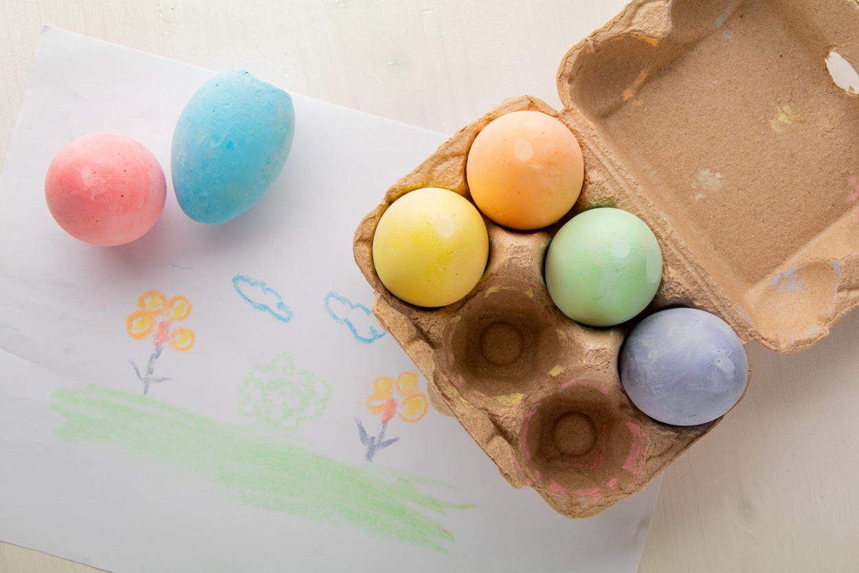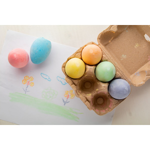 Sada 6 barevných křídových vajíček v kartonové krabičce na vajíčka.
