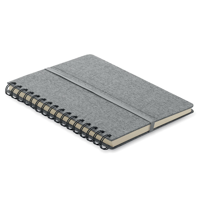 Kroužkový zápisník A5 s pevnou obálkou z materiálu 600D RPET s funkcí stojánku pro smartphone. 160 linkovaných stran (80 listů). 70g recyklovaný papír. Elastický uzavírací pásek.