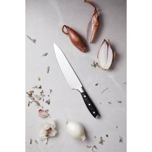 Kuchařský nůž z německé oceli X50CrMoV15 s rukojetí ze dřeva pakka. Díky snadno uchopitelné rukojeti a vynikajícímu vyvážení čepele je práce s nožem pohodlná a snadná. Velikost: 20cm čepel.