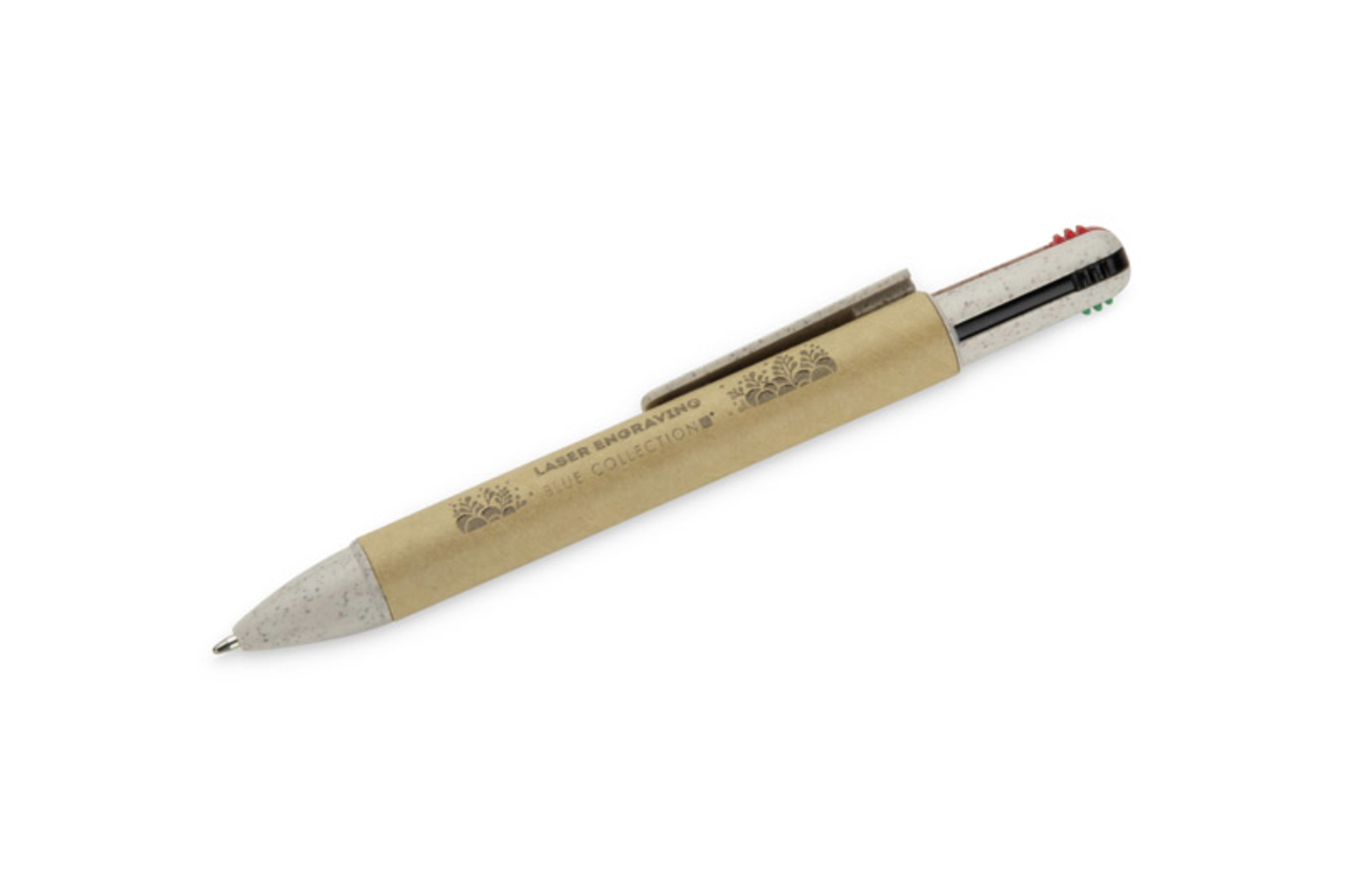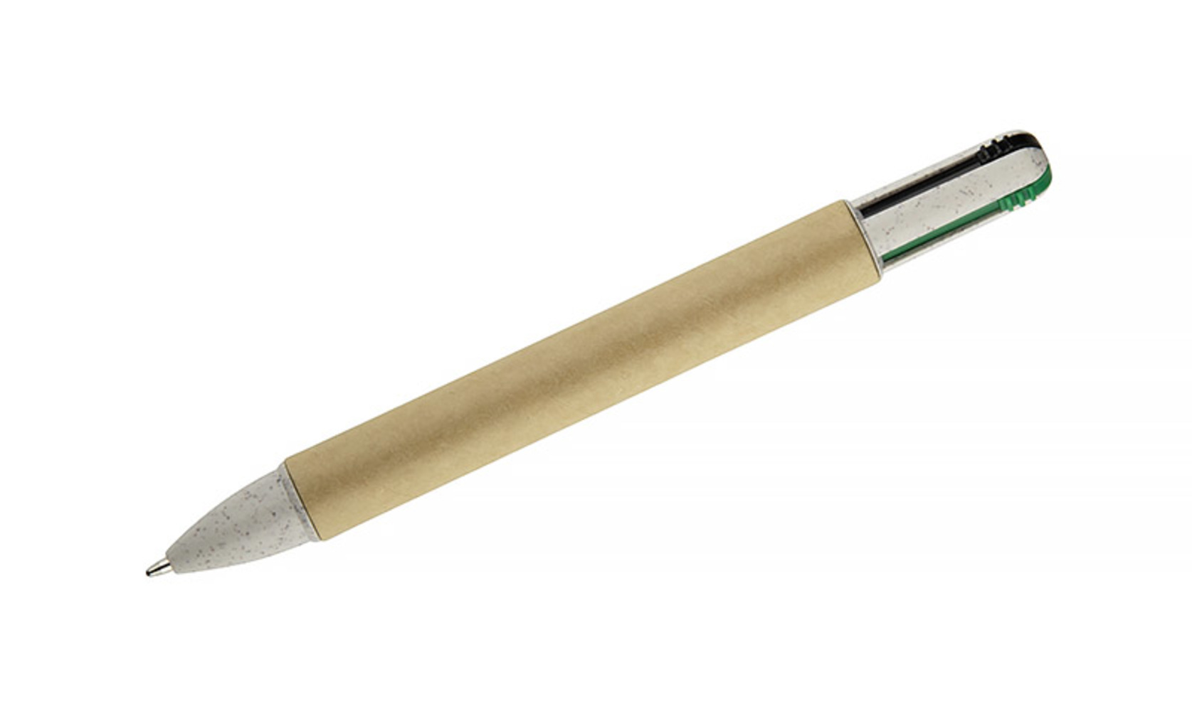 Kuličkové pero MIBO 4 v 1 je praktický kancelářský nástroj, který umožňuje psát čtyřmi barvami - modrou, černou, červenou a zelenou. Díky papírovému tělu je pero lehké a příjemné na používání. Jednoduchý univerzální tvar a automatický mechanismus vysouvání usnadňují rychlé přepínání mezi barvami. Náplně typu X20 s tloušťkou písma 0,7 mm zajišťují hladké a čitelné psaní. MIBO je funkční reklamní pomůcka s možností označení logem.