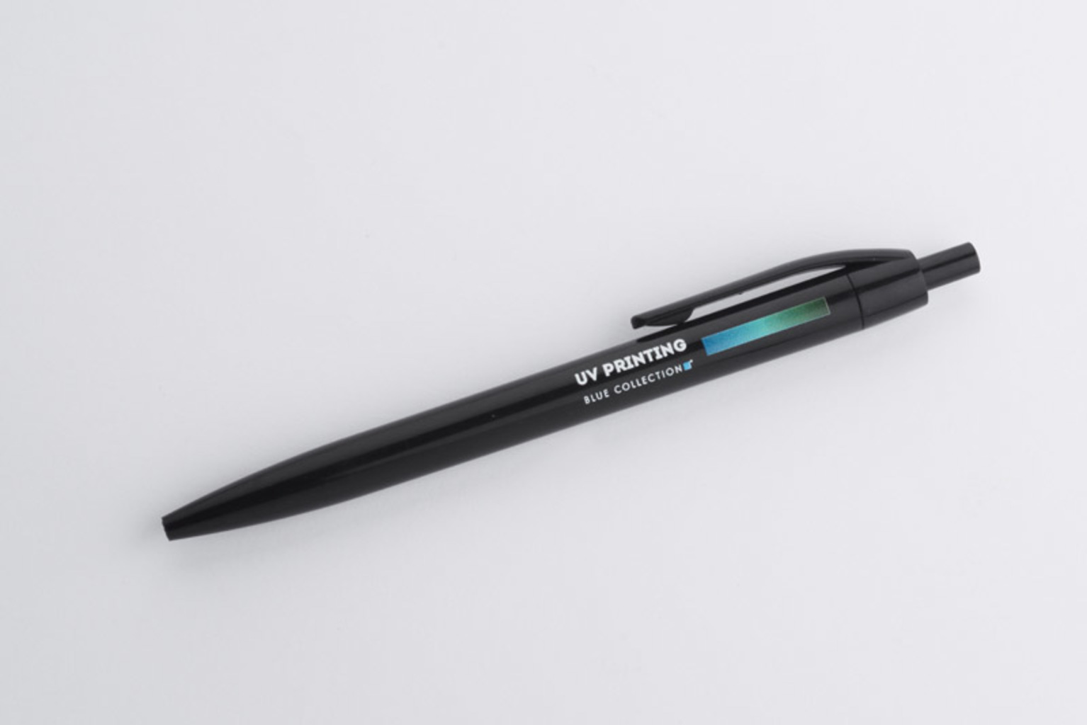 Plastová pera BASIC s modrou náplní. Logo je vytištěno na hlavici.