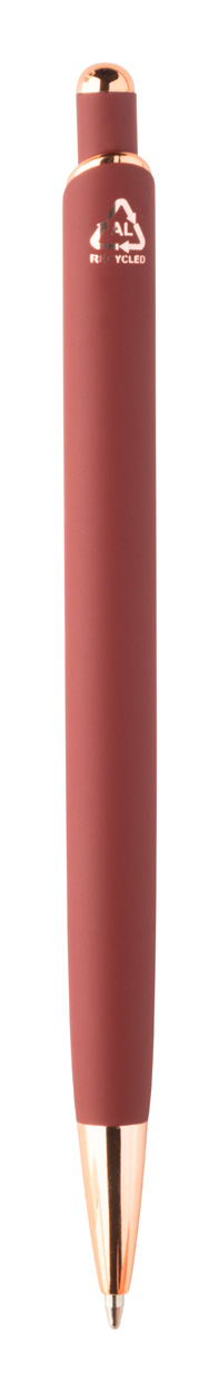 Kuličkové pero z recyklovaného hliníku s pogumovaným povrchem a detaily z růžového zlata. Se speciální povrchovou úpravou pro zrcadlové laserové gravírování v barvě růžového zlata. S modrou náplní.