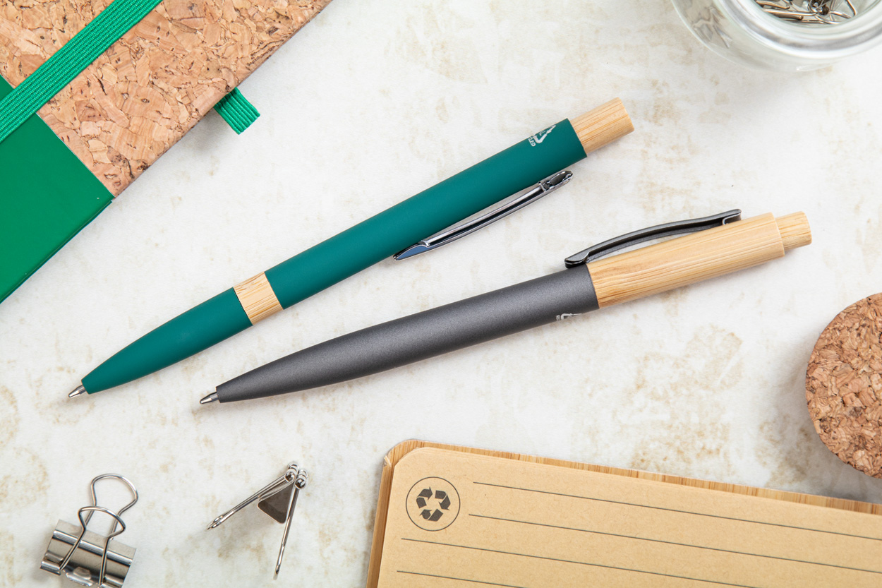Kuličkové pero z recyklovaného hliníku s bambusovými částmi, pogumovaným povrchem a chromovým klipem. Se speciální vrstvou pro zrcadlové laserové gravírování. S modrou náplní.