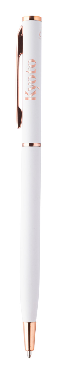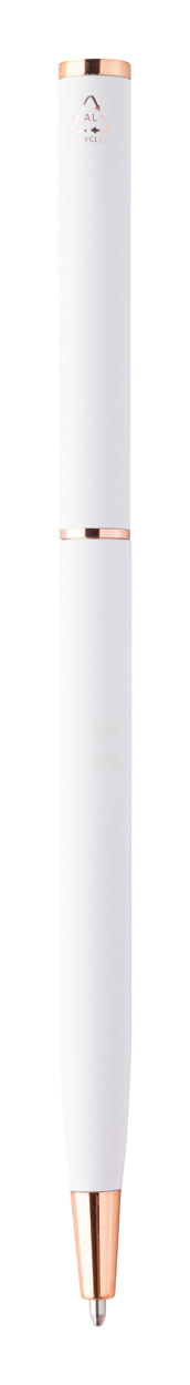 Kuličkové pero z recyklovaného hliníku s pogumovaným povrchem a detaily z růžového zlata. Se speciální povrchovou úpravou pro zrcadlové laserové gravírování v barvě růžového zlata. S modrou náplní.