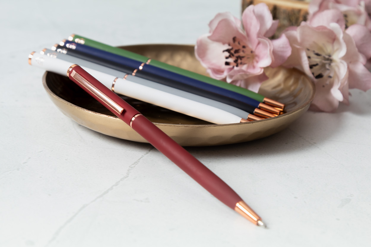 Kuličkové pero z recyklovaného hliníku s pogumovaným povrchem a detaily z růžového zlata. Se speciální povrchovou úpravou pro zrcadlové laserové gravírování v barvě růžového zlata. S modrou náplní.