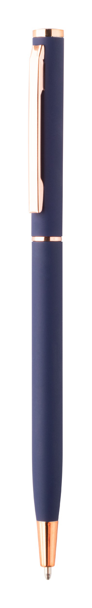 Kuličkové pero z recyklovaného hliníku s pogumovaným povrchem a detaily z růžového zlata. Se speciální povrchovou úpravou pro zrcadlové laserové gravírování v barvě růžového zlata. S modrou náplní.
