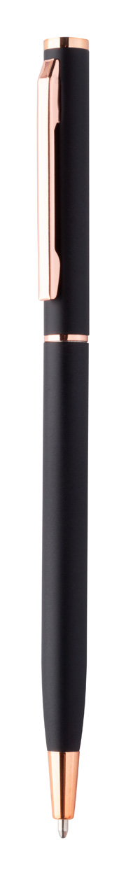 Kuličkové pero z recyklovaného hliníku s pogumovaným povrchem a detaily z růžového zlata. Se speciální povrchovou úpravou pro zrcadlové laserové gravírování v barvě růžového zlata. S modrou náplní.