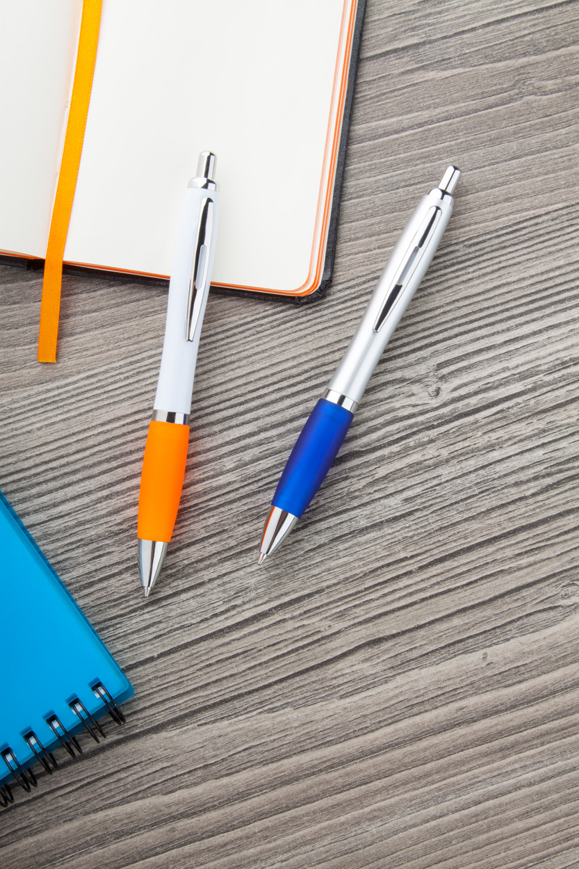 Kuličkové pero s barevným gumovým gripem a s modrou náplní.