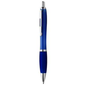 Plastové kuličkové pero s průhledným tělem, úchopem v odpovídající barvě a lesklými chromovanými částmi. S modrou náplní.