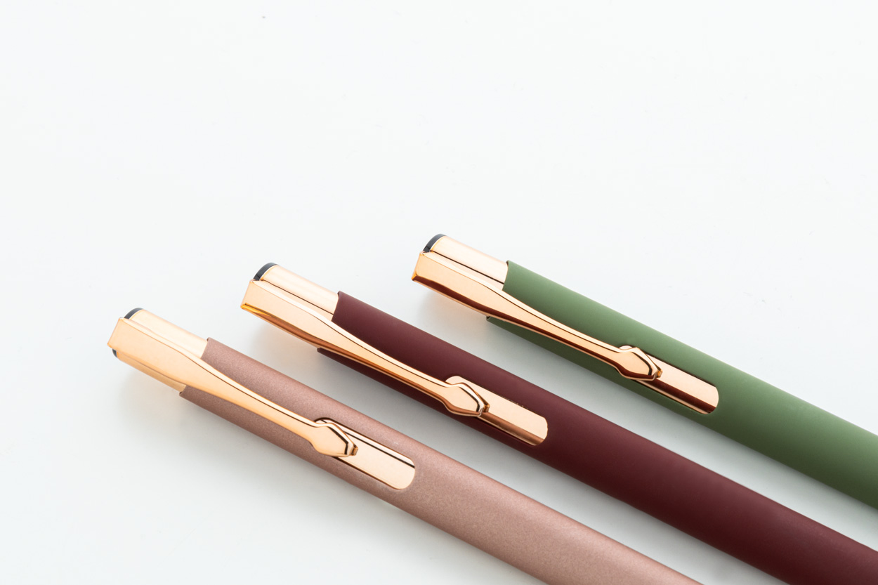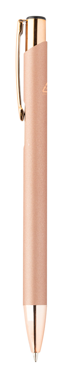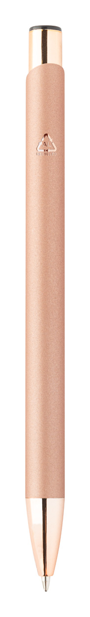Kuličkové pero z recyklovaného hliníku s pogumovaným povrchem a detaily z růžového zlata. Se speciální povrchovou úpravou pro zrcadlové laserové gravírování v barvě růžového zlata. S modrou náplní.