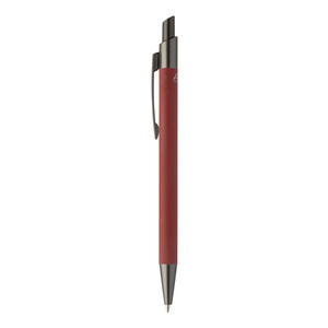 Kuličkové pero z recyklovaného hliníku s pogumovaným tělem a kovovými částmi. S modrou náplní.