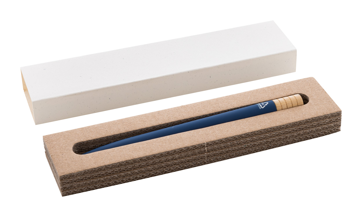 Kuličkové pero z recyklovaného hliníku s kovovým klipem a bambusovým vrškem. S modrou náplní. V kraftové papírové krabičce.