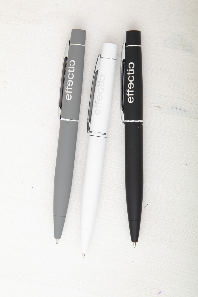 Kovové twist kuličkové pero s pogumovaným povrchem a modrou náplní. Speciální povrch pro laser stříbrného loga.