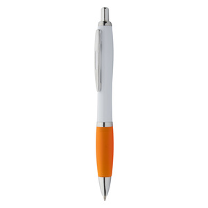 Plastové kuličkové pero s bílým tělem, barevným úchopem a lesklými chromovanými částmi. S modrou náplní.