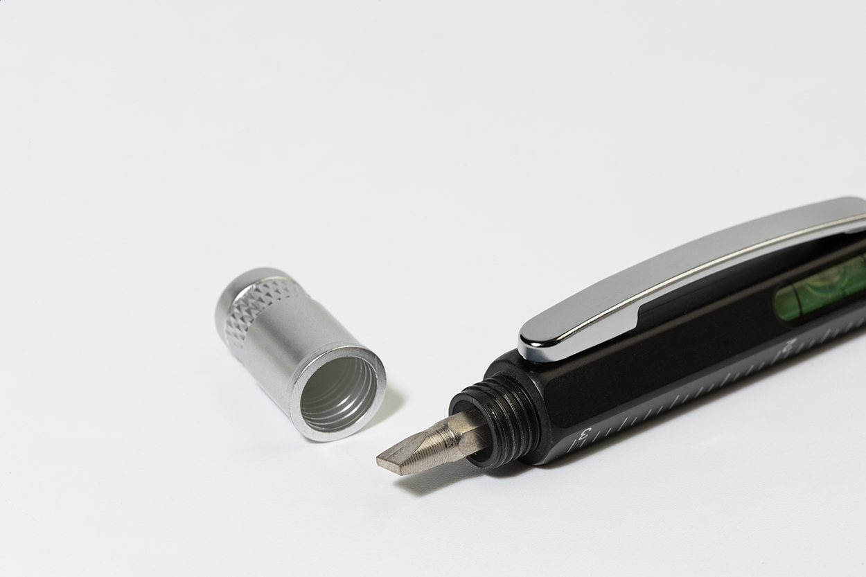 Plastové kuličkové pero s plochými a hvězdicovými šroubováky, vodováhou a pravítkem 7 cm / 3 palce. S kovovým klipem a modrou náplní.