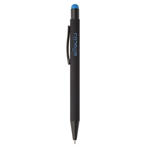 Hliníkové kuličkové a dotykové pero s pogumovanou úpravou a speciálním povrchem pro zrcadlový laser v barvě stylusu, s modrou náplní.