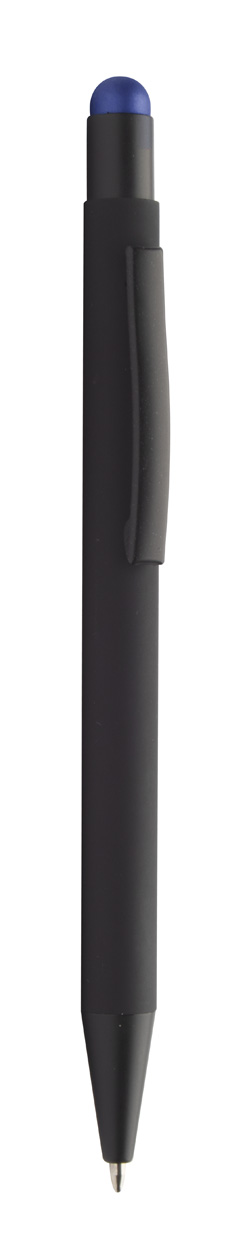 Hliníkové kuličkové a dotykové pero s pogumovanou úpravou a speciálním povrchem pro zrcadlový laser v barvě stylusu, s modrou náplní.