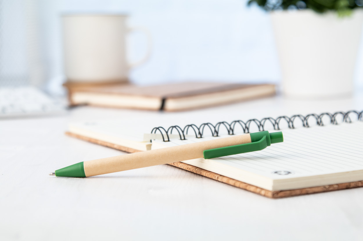Kuličkové pero z recyklovaného papíru s biologicky odbouratelnými plastovými částmi PLA. S modrou náplní.