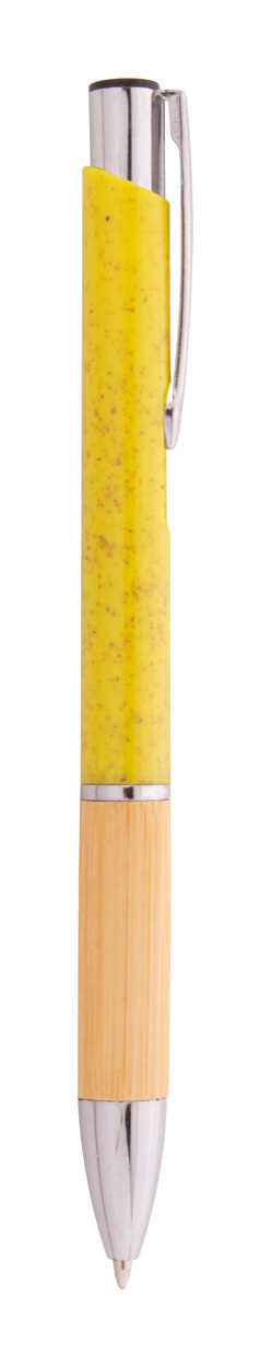 Ekologické plastové kuličkové pero z pšeničné slámy s bambusovým úchopem a kovovými částmi. S modrou náplní.
