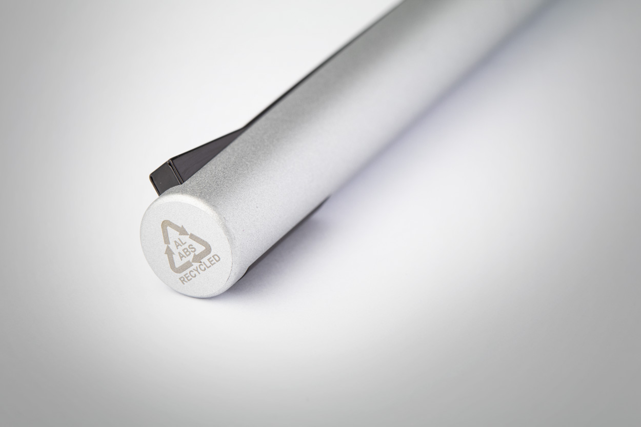 Kuličkové pero z recyklovaného hliníku v matné metalické barvě s horní částí z recyklovaného ABS a speciálním klipem. S modrou náplní.