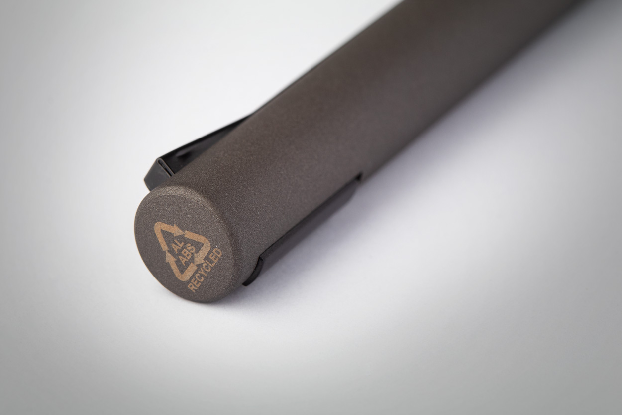 Kuličkové pero z recyklovaného hliníku v matné metalické barvě s horní částí z recyklovaného ABS a speciálním klipem. S modrou náplní.