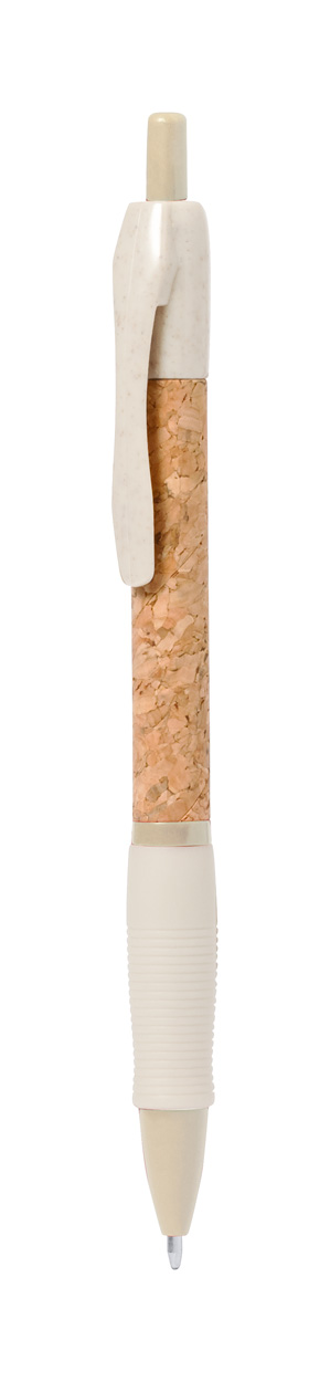 Ekologické plastové kuličkové pero z pšeničné slámy s pouzdrem potaženým přírodním korkem a pryžovým úchopem. S modrou náplní.