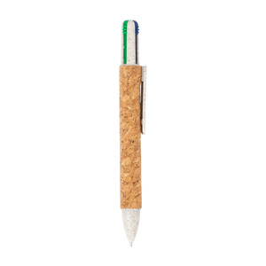 Ekologické plastové kuličkové pero z pšeničné slámy s pouzdrem potaženým přírodním korkem. Se 4 barevnými náplněmi: černá, modrá, zelená a červená.