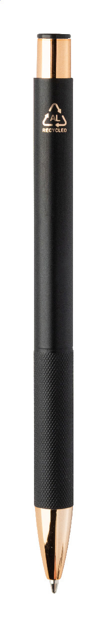Kuličkové pero z recyklovaného hliníku s matným tělem, texturovaným úchopem a detaily růžového zlata. Se speciálním povrchem pro zrcadlové laserové gravírování v barvě růžového zlata. S modrou náplní.