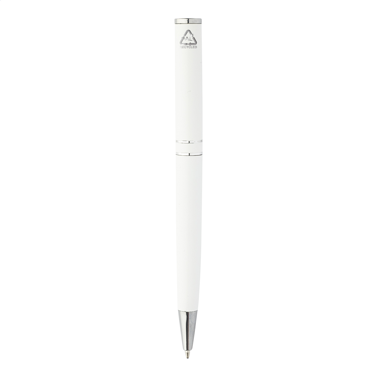 Kuličkové pero z recyklovaného hliníku s chromovanými částmi a kroužky. V černé dárkové krabičce. S modrou náplní.