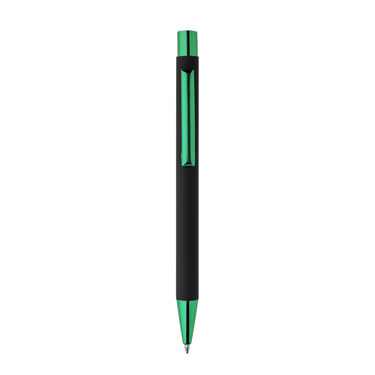 Kuličkové pero z recyklovaného hliníku s černým pogumovaným tělem a barevnými lesklými kovovými částmi. Se speciálním povrchem pro zrcadlové gravírování, které ladí s kovovými částmi. S modrou náplní.