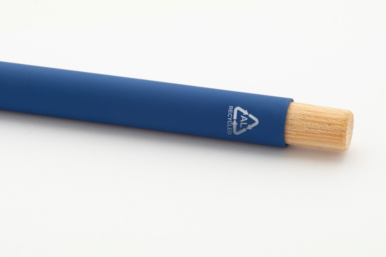 Kuličkové pero z recyklovaného hliníku s pogumovaným povrchem a bambusovým tlačítkem a chromovými detaily. Se speciální vrstvou pro zrcadlové laserové gravírování. S modrou náplní.
