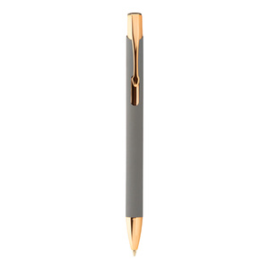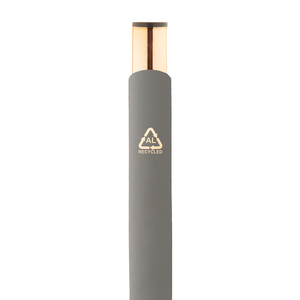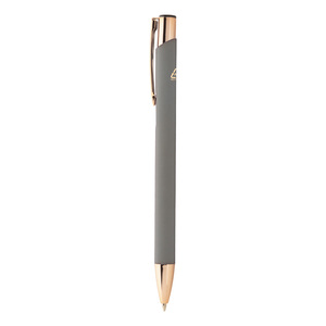 Kuličkové pero z recyklovaného hliníku s pogumovaným povrchem a detaily z růžového zlata. Se speciální povrchovou úpravou pro zrcadlové laserové gravírování v barvě růžového zlata. S modrou náplní.