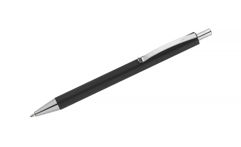 Propiska NOMI s příjemným na dotek gumovaným povrchem a chromovanými prvky stříbrné barvy. Náplň modré barvy.