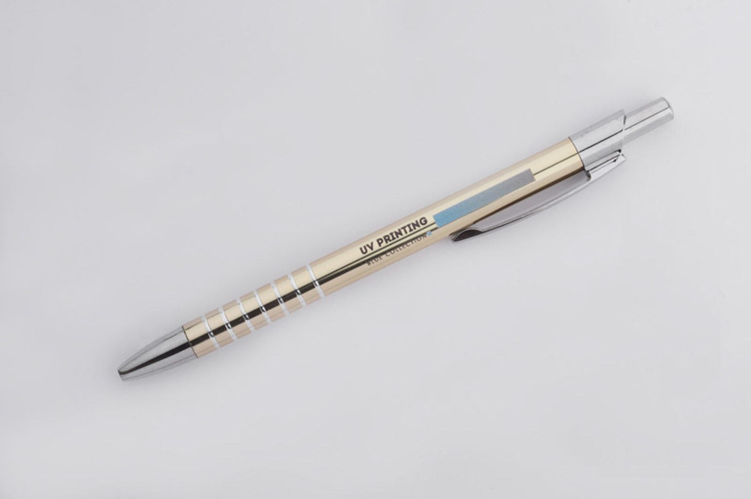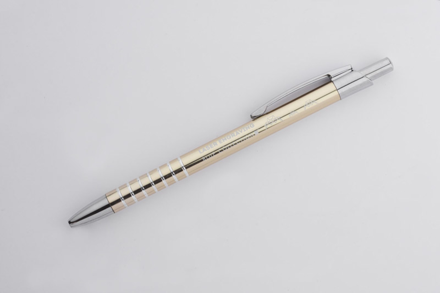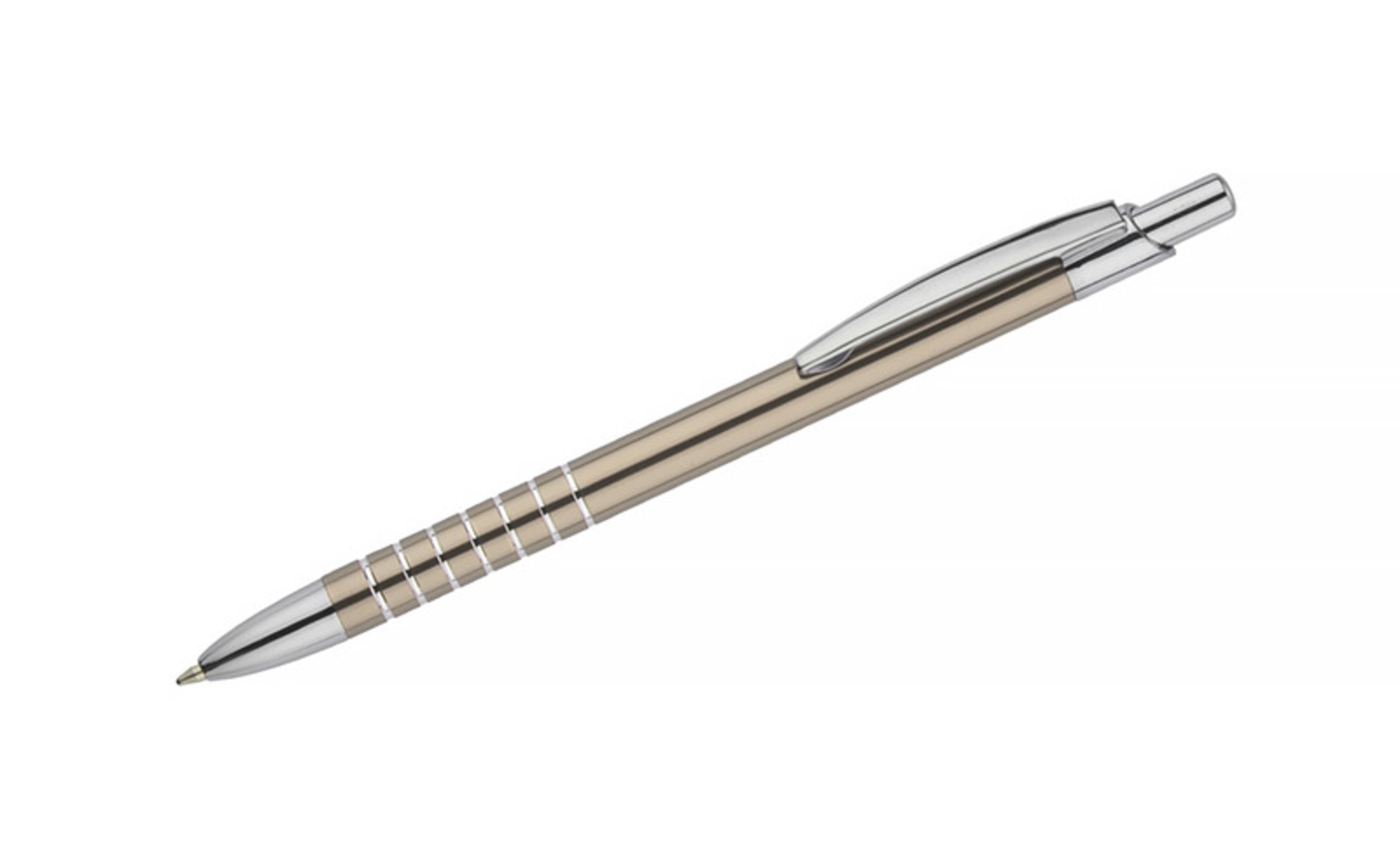 Prostá pero vyrobené z hliníku, ozdobené širokými prsteny. Logo bude vyryté.