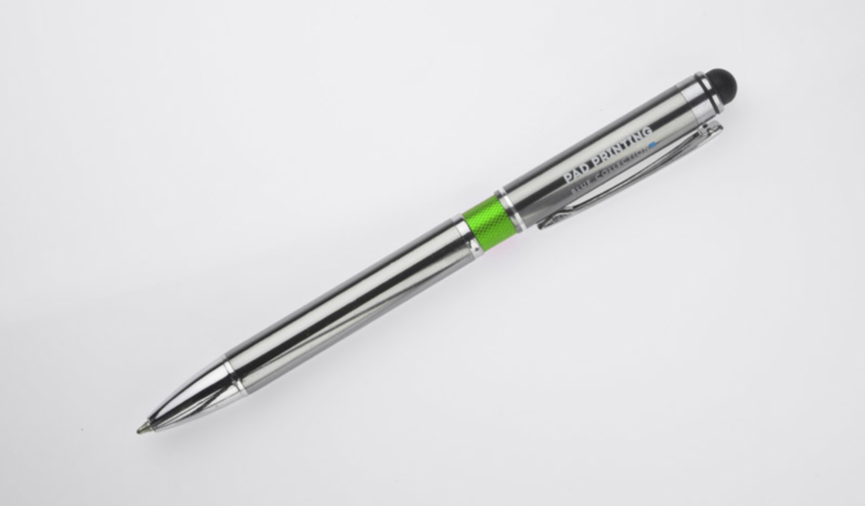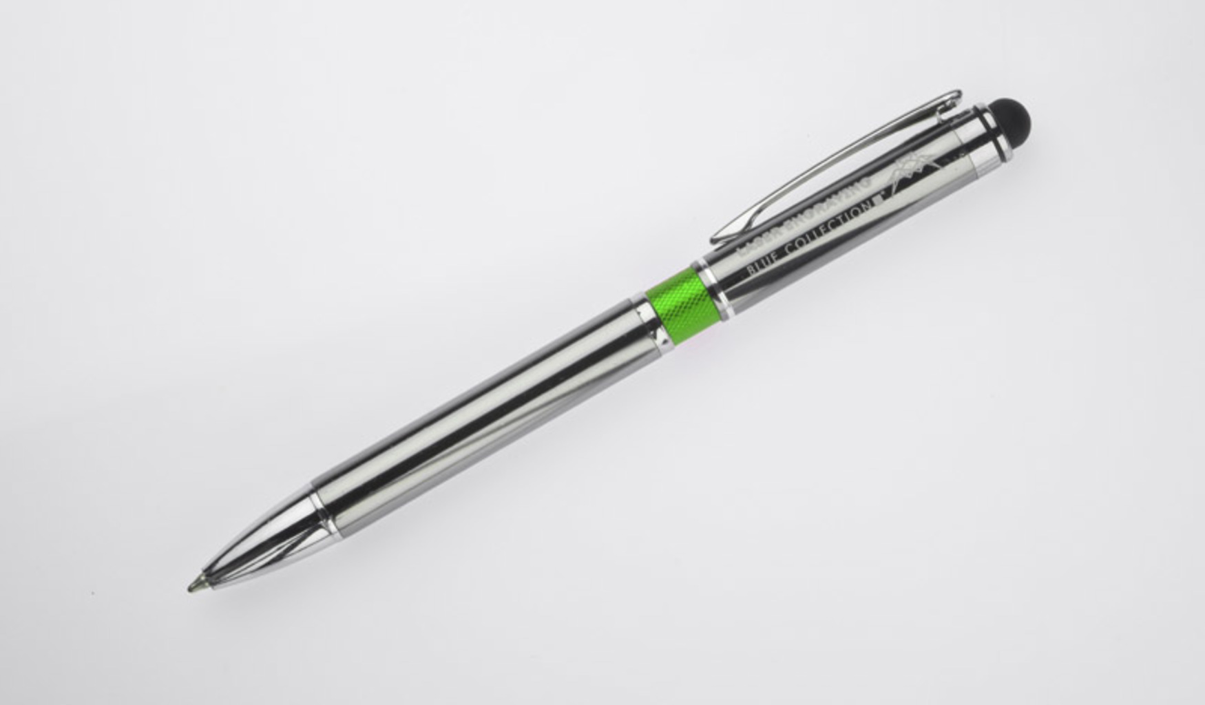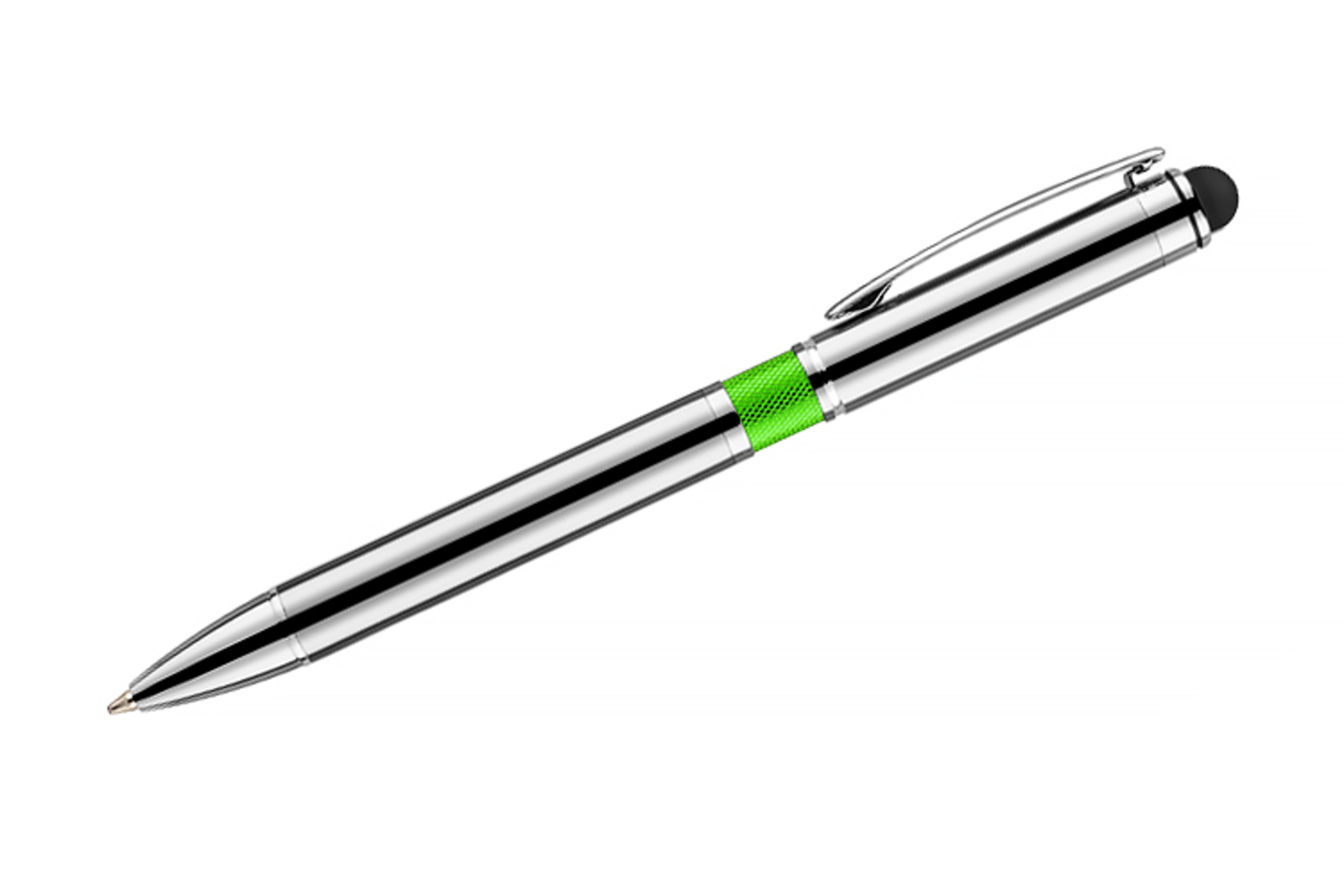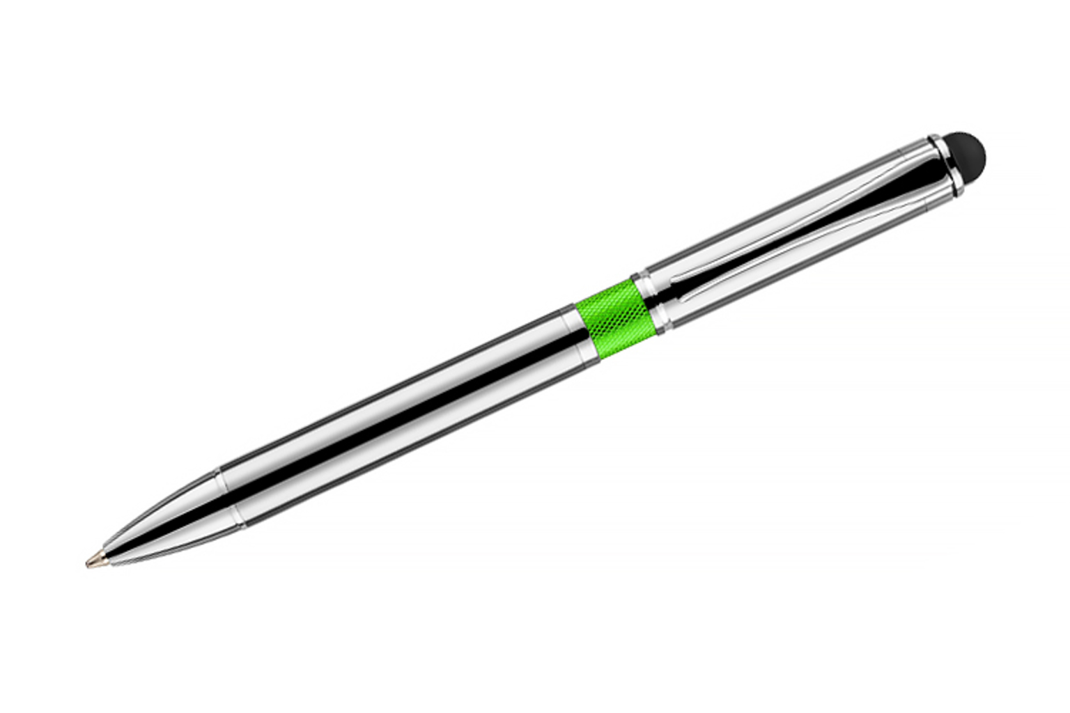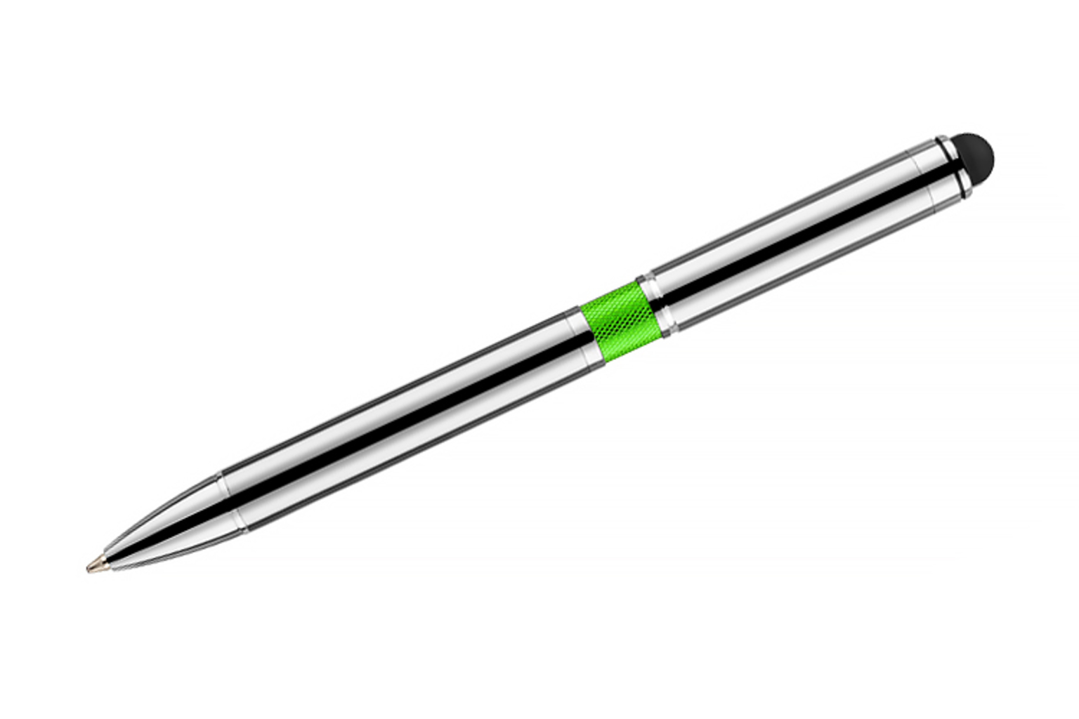 Elegantní kovová pero s barevnou lištou a dotykovým perem.
