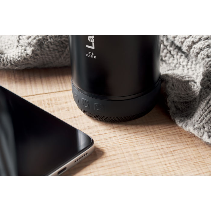 Dvoustěnná vakuová izolační láhev z recyklované nerezové oceli (90 % recyklované nerezové oceli a 10 % nerezové oceli). Silikonové poutko a odnímatelný 3W bezdrátový reproduktor. Objem: 500 ml. Baterie s kapacitou 500 mAh. Pro čištění lze reproduktor vyjmout.
