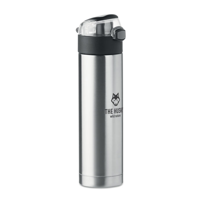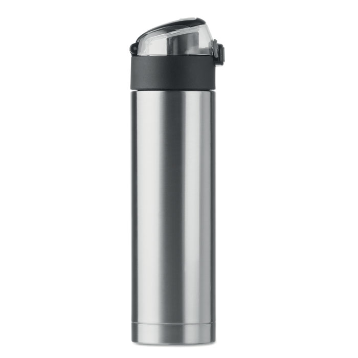Nerezová 400ml láhev na pití s bezpečnostním uzávěrem a otvíráním ''press-to-open''. Skládací rukojeť pro lepší nošení. . Neteče.