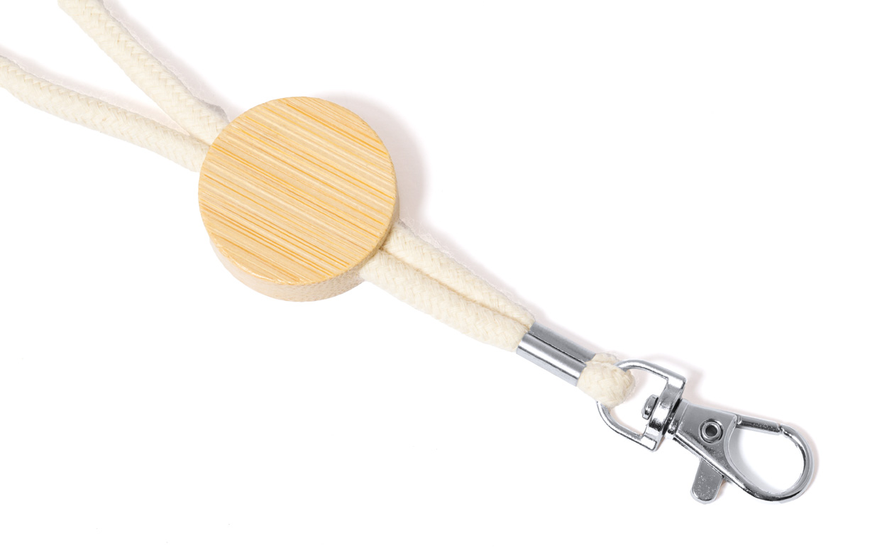 Bavlněná šňůrka na krk s kovovou karabinou, bezpečnostní přezkou a kulatým bambusovým štítkem.