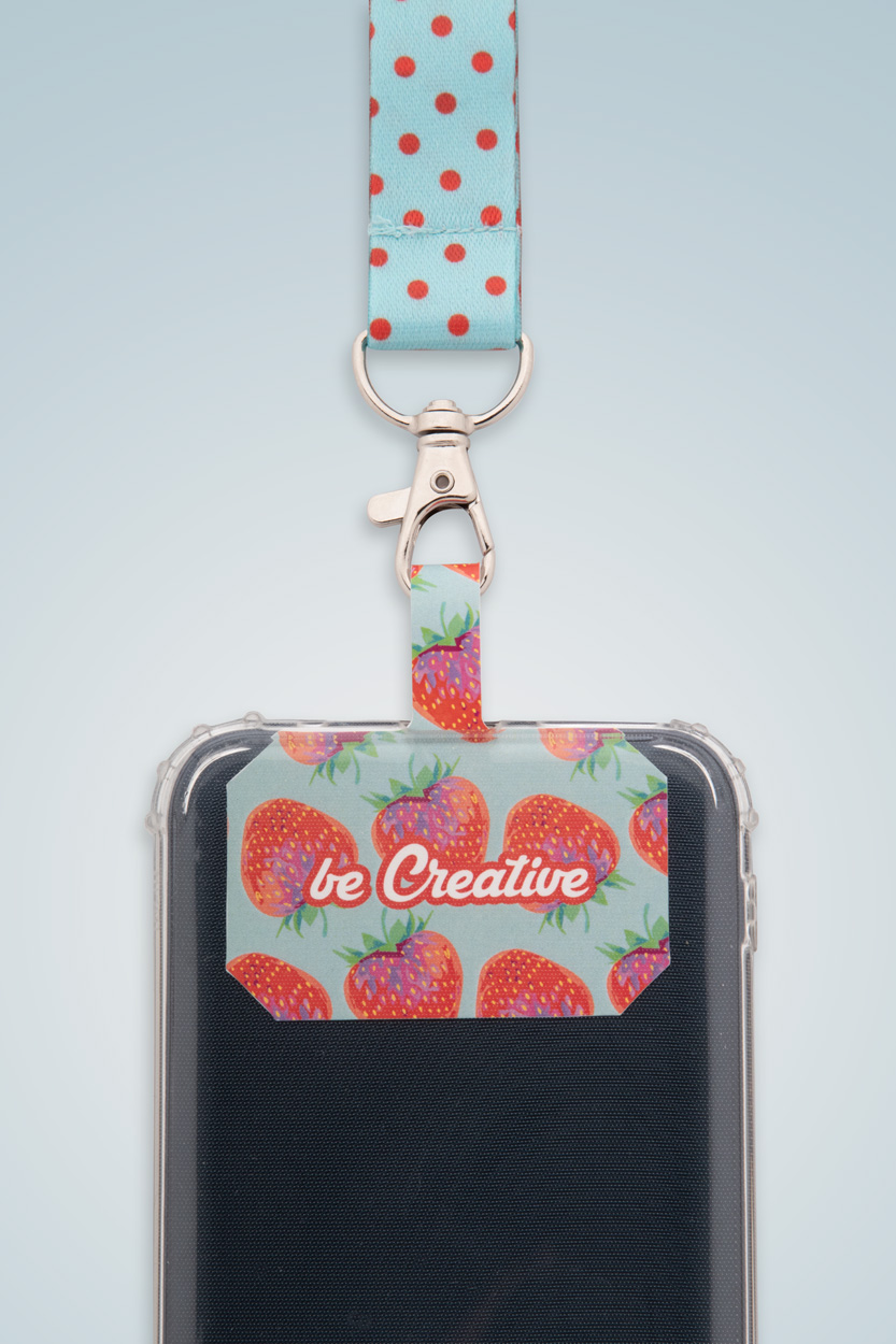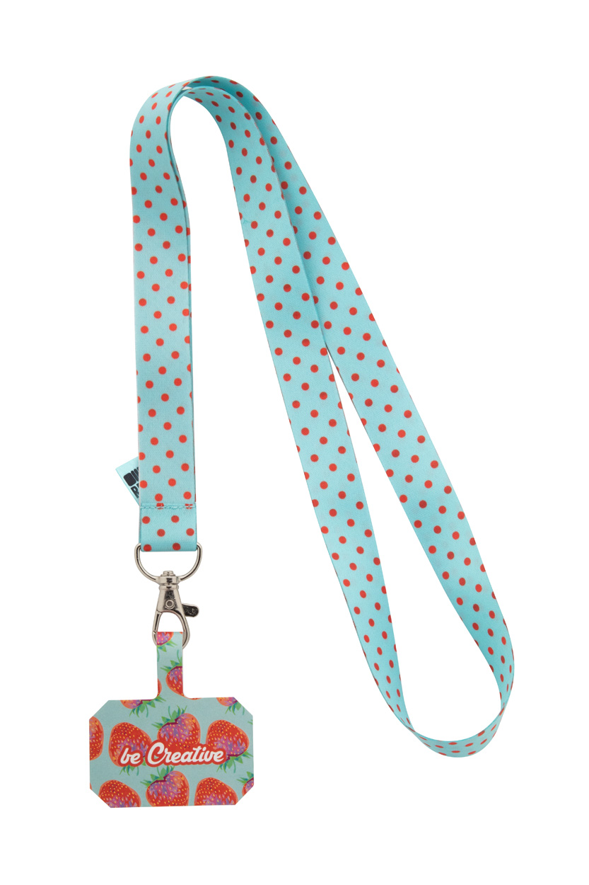 Na zakázku vyrobený RPET lanyard na mobil s kovovou karabinou a barevně potištěnou vložkou na telefon z papíru odolného proti roztržení. Cena včetně sublimačního tisku na obou stranách, nezahrnuje tiskovou přípravu. Min. mn.: 50 ks.